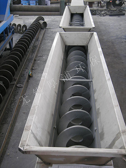無軸螺旋輸送機(jī)是用于傳輸工業(yè)生產(chǎn)過程中產(chǎn)生的各種廢物及濾渣,結(jié)構(gòu)形式為無軸螺旋,物料由進(jìn)口輸入,經(jīng)螺旋輸送至尾端排放,整個傳輸過程除進(jìn)出口料斗外均在密閉槽體中進(jìn)行。傳動采用軸裝式減速機(jī),并在減速機(jī)端設(shè)置軸承及防塵油封。設(shè)備運(yùn)行過程中沒有高速運(yùn)轉(zhuǎn)部件,螺旋下襯耐磨尼龍,磨損低,維護(hù)量小。